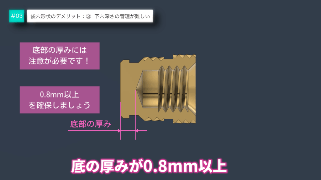 袋穴の設計では、工具のドリル角度や底部の形状によって、狙った通りの下穴深さを加工するのが難しい場合があります。特に注意が必要なのが、袋穴の底部の厚みです。