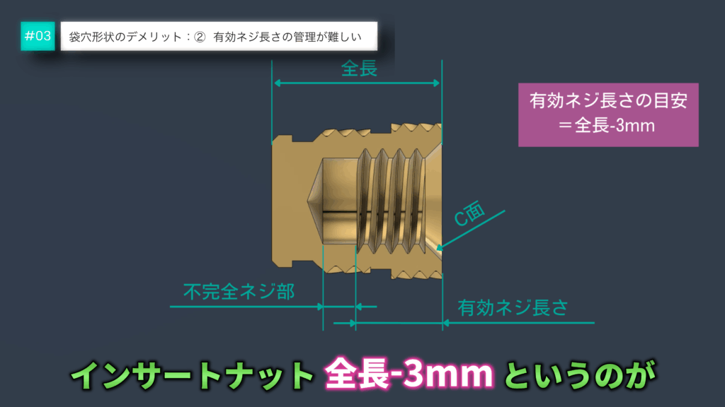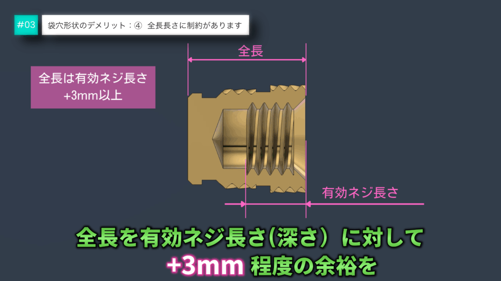 一般的な目安として「全長-3mm」が有効ねじ長さの最大値です。