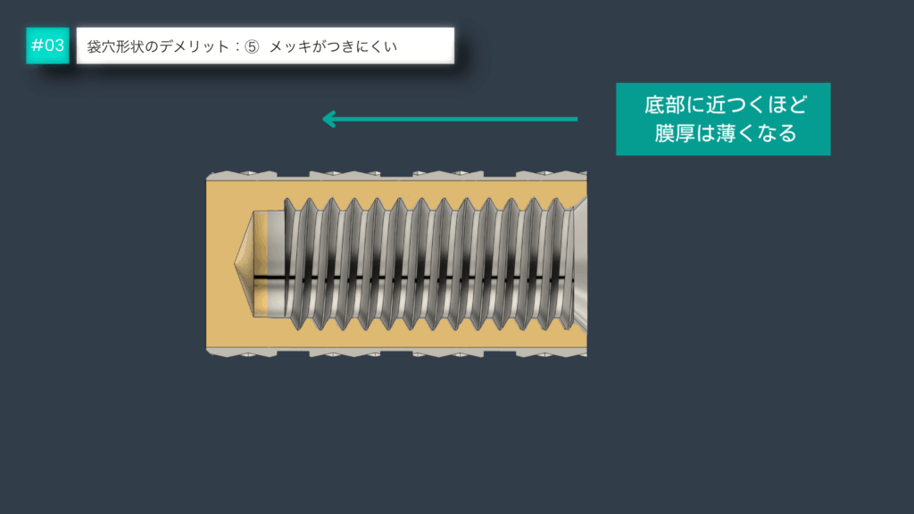 袋穴形状を設計する際は、内部のめっきが均一に付かない可能性を考慮することが重要です。袋穴内部では、表面張力によりねじ入り口が「蓋」のようになったり、電気が流れ難いという特性のため、めっき液が底部まで届きにくくなります。