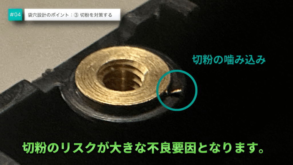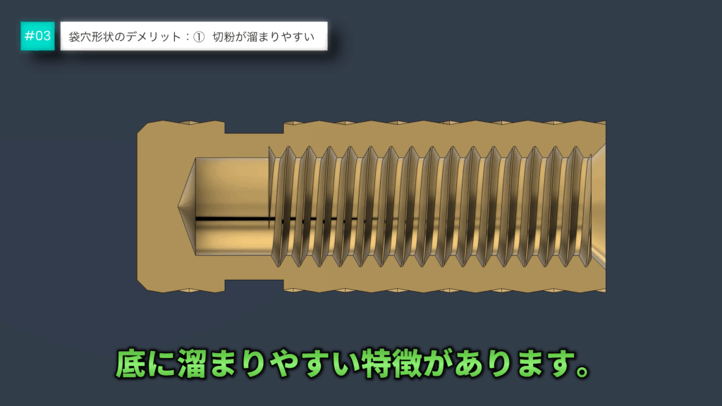 袋穴は構造上、加工時に発生した切粉が部に溜まりやすい特徴があります。洗浄工程やエアブローで除去を試みても、完全に取りきれないケースも多いです。残留切粉がそのまま品質不良の原因となるリスクがあります。