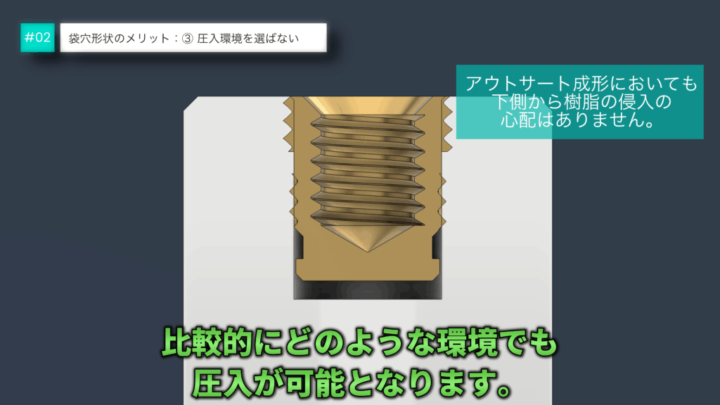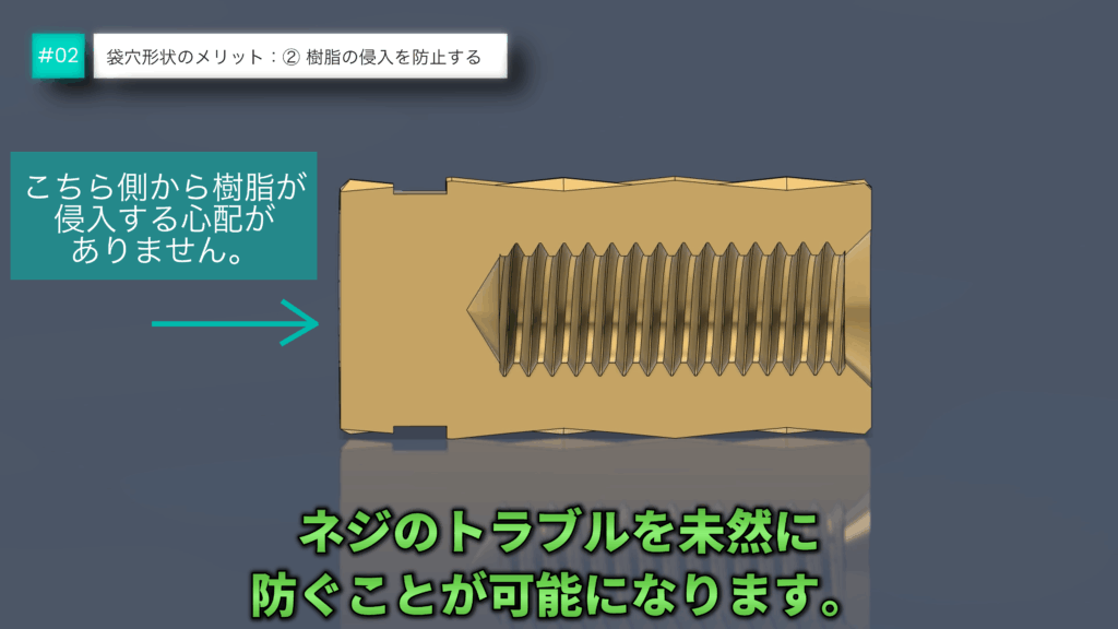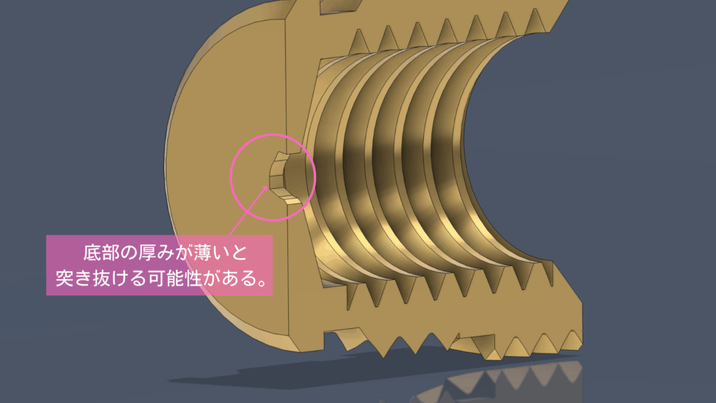 袋穴構造にすることで、反対側からねじ内部へ樹脂が入り込む心配がなく、ねじ部のトラブルを未然に防ぐことができます。もし樹脂が入り込むと、ねじ込み不良締結強度の低下につながる可能性があり、製品全体の信頼性を損なう原因になりかねません。