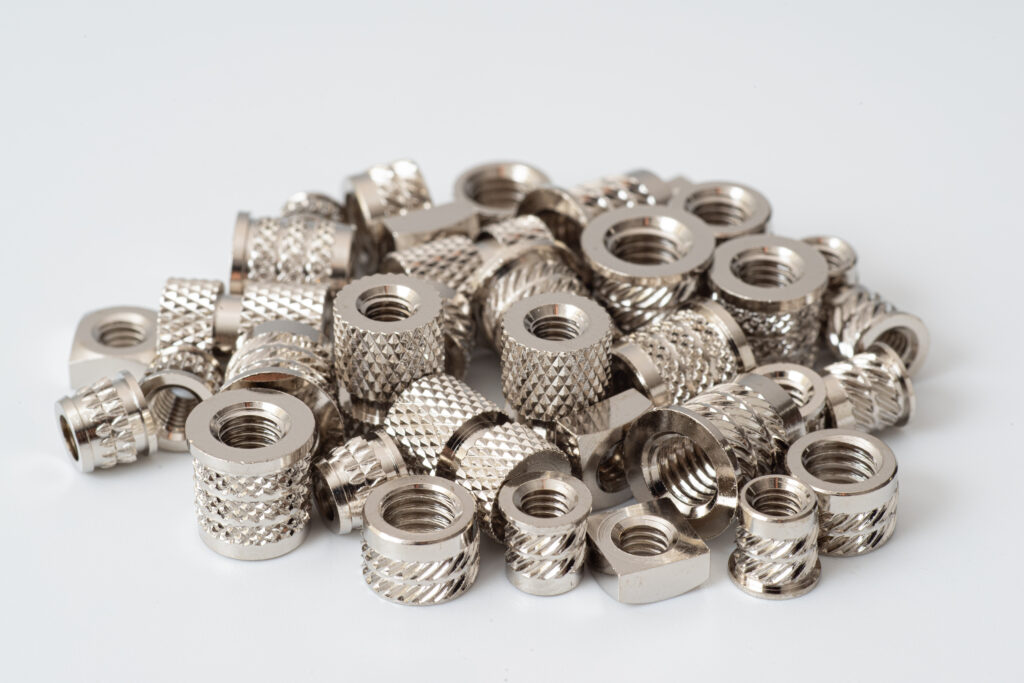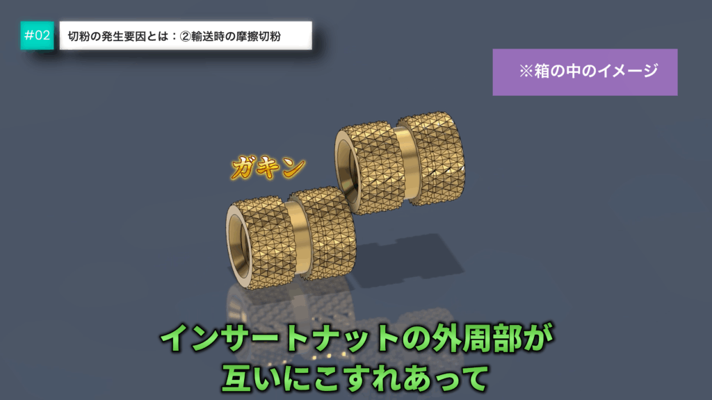 インサートナットの外周部が互いに擦れ合い、ローレット部分や面取り部から微細な金属粉が削り出されるのです。特に海外への輸送など長距離の輸送を伴う場合、発生がしやすくなります。