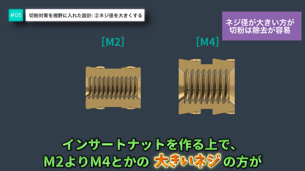 インサートナットのネジ径を大きくする事も有効です。物理的にサイズを大きくする事で切粉の排出をしやすくします。軸力や面圧、コストなどを考慮し検討しましょう。