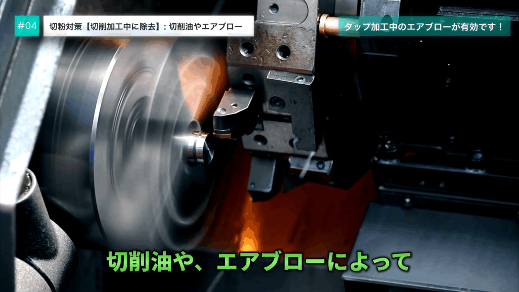 また、エアブローにより物理的に、切粉を吹き飛ばし除去する方法も有効です。
