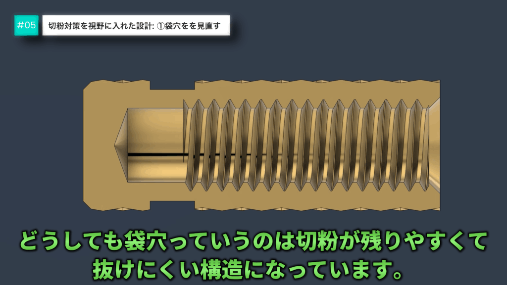 そのため、可能であれば袋穴構造を避け、貫通穴とすることで切粉残留のリスクを大幅に低減できます。
