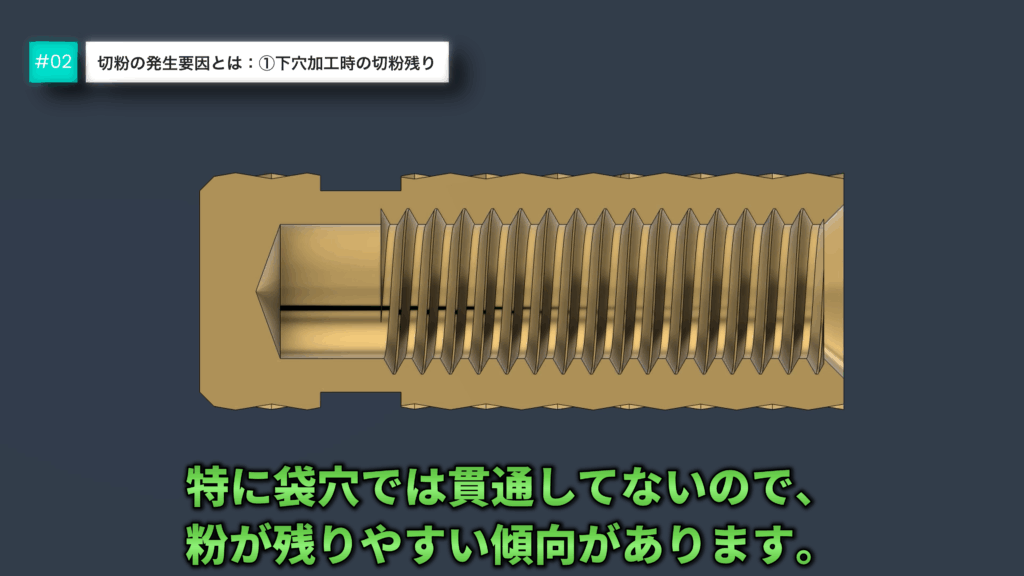 特に袋穴では、切粉が重力で自然に落ちにくく、残留リスクが高くなります。