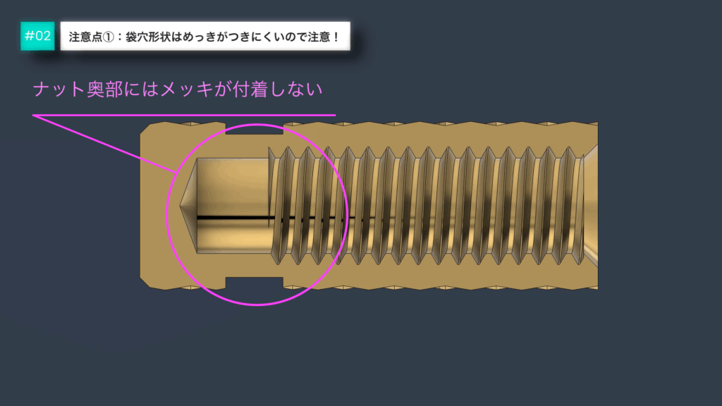 インサートナットが袋穴形状である場合、穴の奥深くまでめっきが均一に析出しない可能性があります。