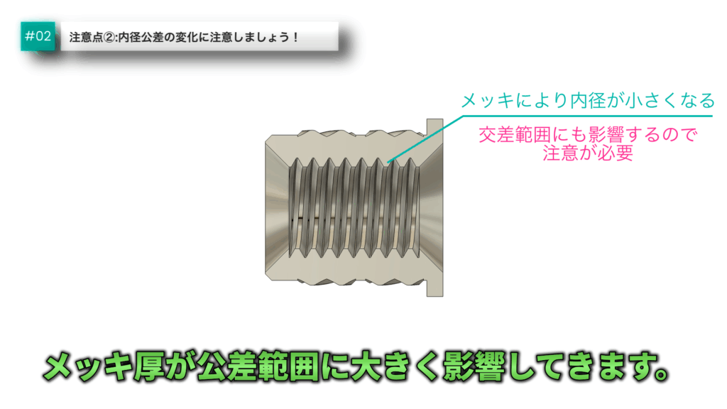 メッキをすると、インサートナットの内径寸法がわずかに減少します。