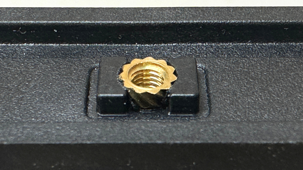 樹脂下穴の設計やナット形状を再設計させて頂き、樹脂が漏れる事なく、且つボスと面一に仕上げる事ができました。右の写真では左右の樹脂とナットの高さが同じなのがわかると思います。