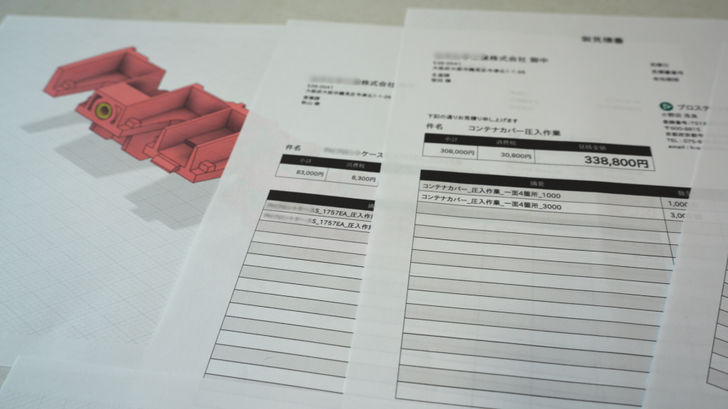 お客様より、ワークサンプルを幾つか送付いただき、実物で検討を進めた後に正式見積書をご提示させていただきます。